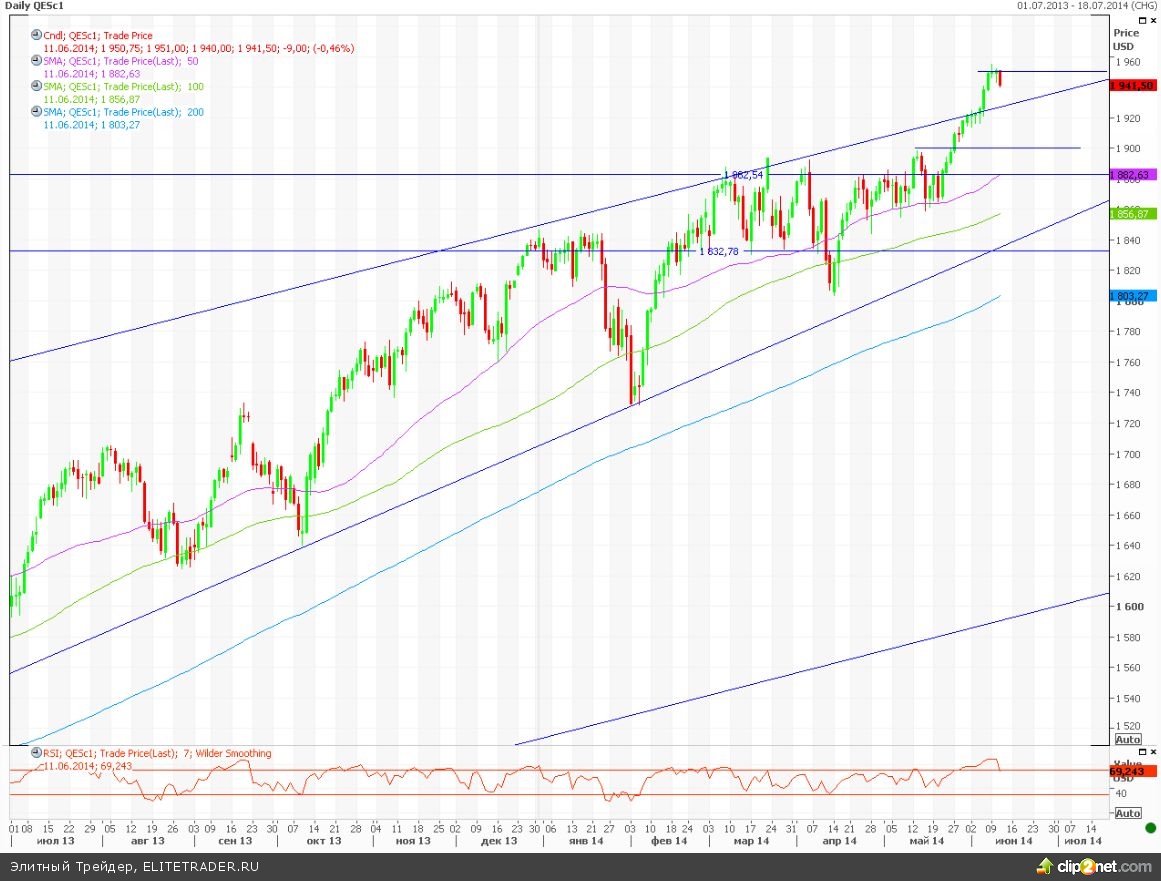 Техническая картина: на данный момент фьючерсу на SnP 500 не удалось взять психологический уровень в 1950 пунктов. Снижение на данный момент несущественно, и в качестве ближайшей поддержки может выступит уровень 1927 пунктов – предыдущее сопротивление и верхняя граница глобального восходящего канала, из которого фьючерс вырвался несколько дней назад. Однако текущее движение пока может быть частью консолидации. Об изменении технической картины и возможном начале серьезного падения можно будет говорить при пробитии фьючерсом другой важной психологической отметки – 1900 пунктов.