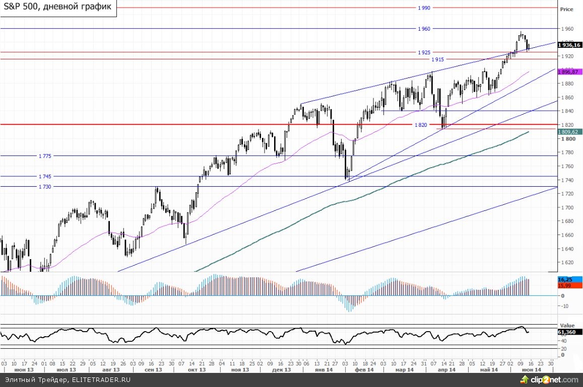В данный момент фьючерсный контракт на SnP 500 торгуется с понижением на 0,35% около отметки 1929.