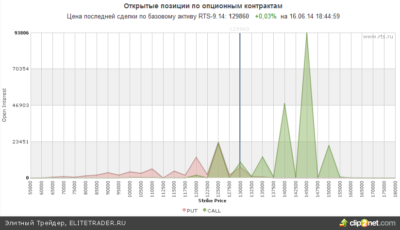 Между тем открытые опционные позиции по RIU4 со сроком исполнения 15.07.14 сейчас не дают однозначного сигнала. Максимальное количество открытых опционов пут расположилось на уровне 125000, что говорит о сильной поддержке на этой отметке. При этом максимальное количество открытых позиций по опционам колл расположено лишь в районе 145000.