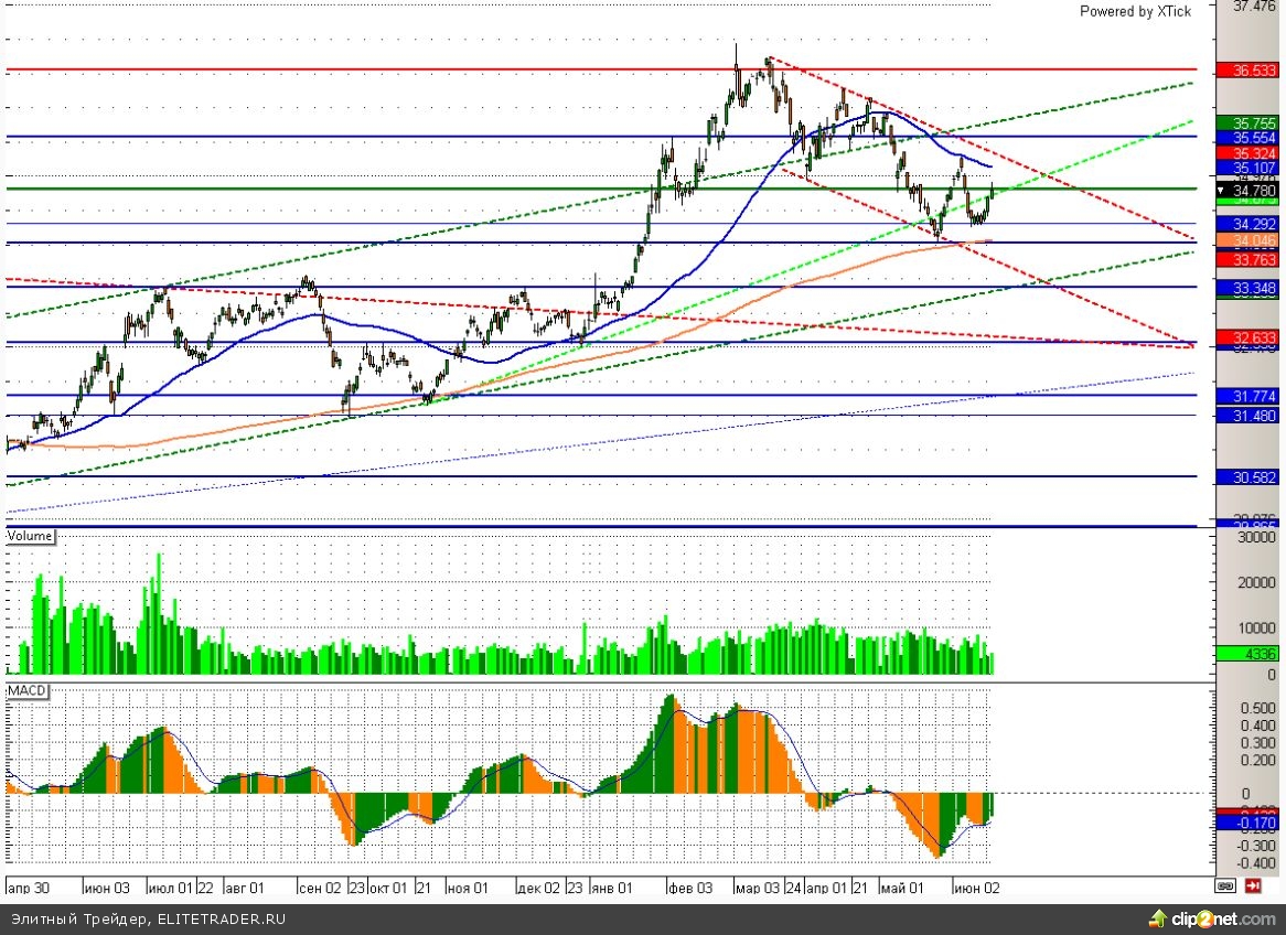 Определенное давление на валюты развивающихся стран сегодня также оказывают данные по китайской экономике. Объем прямых иностранных инвестиций в Поднебесную в годовом выражении вырос в мае всего на 2,8% после 5%месяцем ранее. На этом фоне пара доллар/рубль вплотную подобралась ко второй цели отскока в районе отметки 34,8. Пока от снижения российскую валюту не спасают ни высокие цены на нефть, которые торгуются выше 112 долларов за баррель по сорту Brent, ни предстоящие налоговые выплаты. При этом еще накануне состоялось заседание Банка России, где регулятор заявил, что не исключает повышения ключевой ставки в случае роста инфляционных ожиданий. Данный момент также позитивен для рубля, но скажется видимо только после, того как украинский фактор снова уйдет на второй план. Поэтому спешить с покупкой долларов сейчас не стоит, а вот спрос на российскую валюту скоро снова может вырасти. Ближайшая поддержка данной валютной пары располагается в районе 34,3. Сопротивления: 34,8 и 35,1.