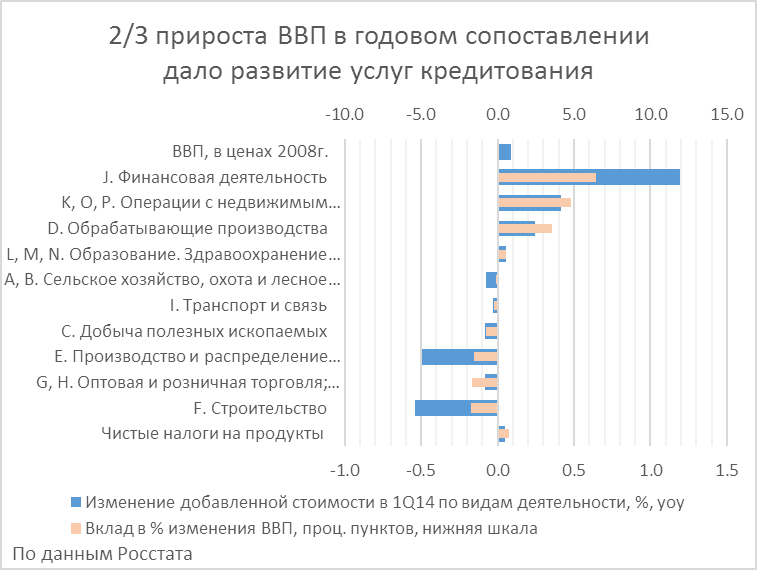 Тем не менее, значительное сокращение инвестиционной строительной деятельности (более 8% в годовом выражении против 4Q13) и транспортных потоков (около 5% год.) поддерживают вывод о реальном, хотя в целом и неглубоком (из-за продолжающегося быстрого развития финансовых и некоторых других услуг) спаде в экономике РФ в первой четверти текущего года.