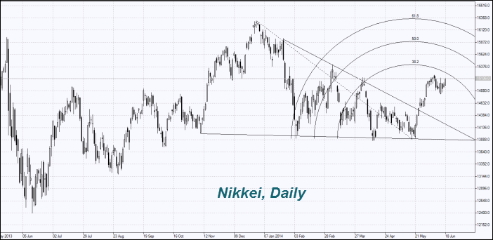 Японский Nikkei сегодня вырос второй день подряд в рамках своего нейтрального тренда. Данные по внешней торговле Японии за май оказались в целом неплохими. Экспорт упал впервые за 15 месяцев на 2,8%, но импорт сократился сильнее — на 3,6%. В итоге уменьшение отрицательного сальдо торгового баланса превысило прогнозы. Кроме этого продажи супермаркетов в мае также продемонстрировали позитивную динамику. Напомним, что завтра рано утром в Японии выйдут еженедельные данные Минфина по инвестициям, а также три экономических показателя за апрель. После этого следующие значимые данные будут только 27 июня.