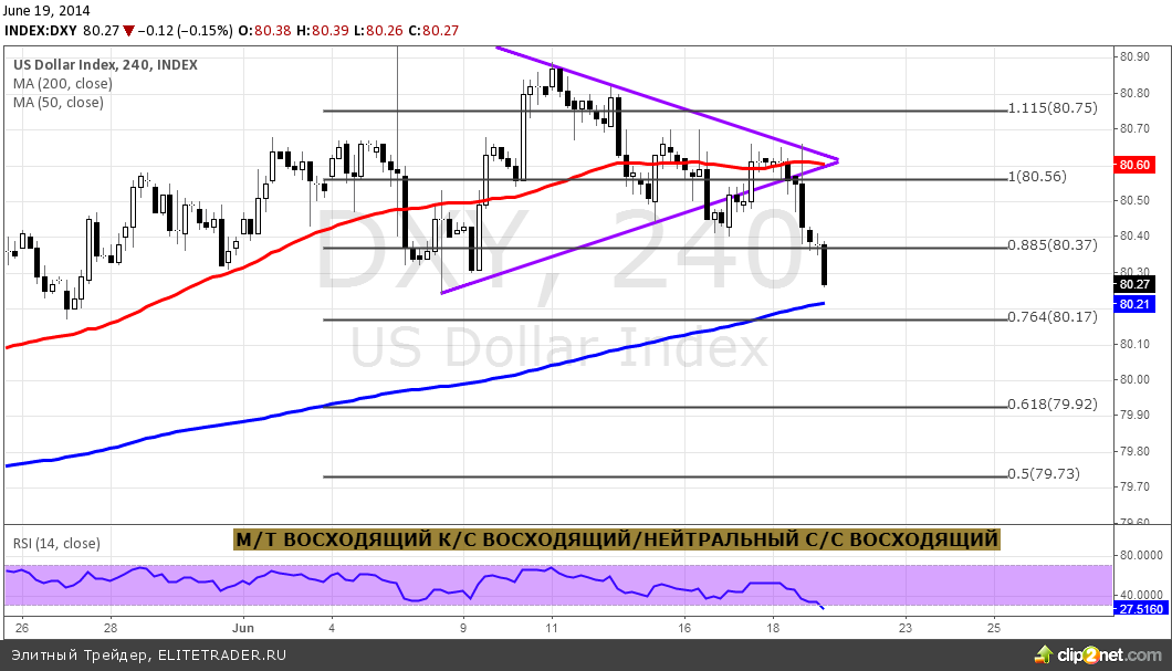 Доллар США (DXY) снижается на фоне решения и комментариев управляющей ФРС США в район 200 периодной скользящей средней к отметке $80.21. Сопротивлением для восходящего движения становится уровень 80.37. Снижение открывает путь к целям в виде 81.17 и 79.92, где проходят 76 и 62 фибо линия.