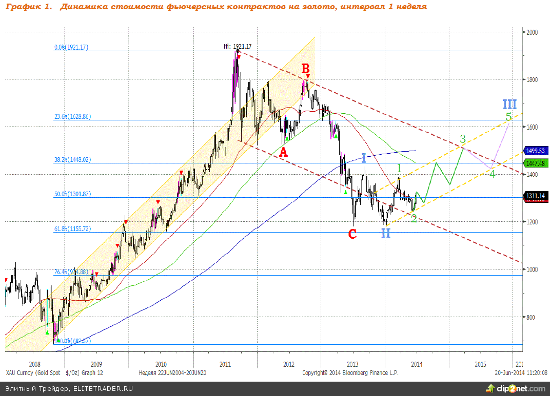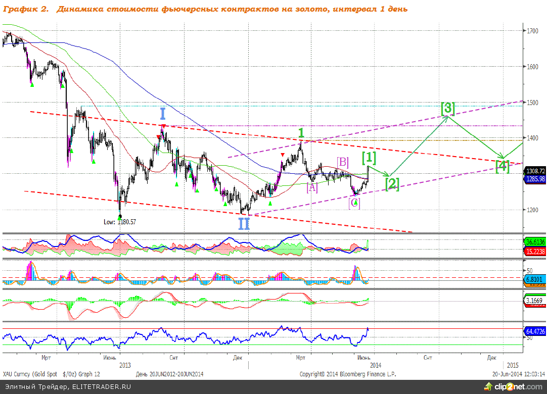 Цены на золото завершили формирование коррекционной волны [2], в рамках которой котировки драгоценного металла снизились до уровня $1240 за тройскую унцию. Довольно часто волна [1] корректируется глубоко, что позволяет сформировать так называемое «тройное дно» – один из вариантов разворотной модели. Резкое движение котировок вверх началом возобновления роста – стартом восходящей растянутой волны [3], целью развития которой видим уровень $1450 за тройскую унцию. Предполагаемая структура динамики цен на золото отображена на графиках 1 и 2.