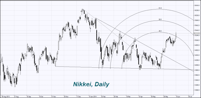 Японский Nikkei повысился и вышел из нейтрального тренда наверх. Кроме позитива с мировых фондовых рынков этому способствовали хорошие новости из Китая. Местное правительство одобрило меры, которые должны обеспечить рост ВВП на 7,5% в 2014 году. Кстати, данное сообщение также способствовало повышению некоторых товарных фьючерсов. Вчерашние японские макроэкономические показатели совпали с прогнозами, а следующие будут лишь 27 июня. Отметим, что Банк Японии по примеру ФРС, впервые сократил объем выкупа активов за счет допэмиссии иены. Отметим, что это уменьшение было не значительным и касалось только долгосрочных гособлигаций.