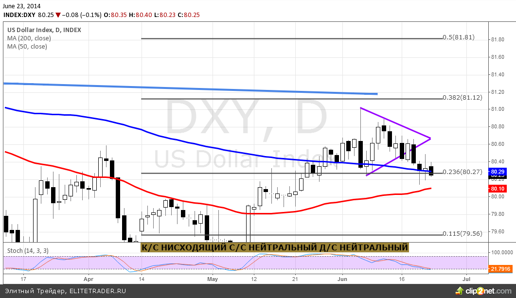 Индекс доллара США (DXY) снижается на фоне выхода из границ паттерна “Равнобедренный треугольник” в район поддержки 80.27, вблизи которого проходят 200 дневная MA, а чуть ниже проходит линия 50 дневной простой скользящей средней. О возможном начале укрепления доллара США дает сигнал осциллятор Stochastic, приближающийся к нижнему уровню 20.