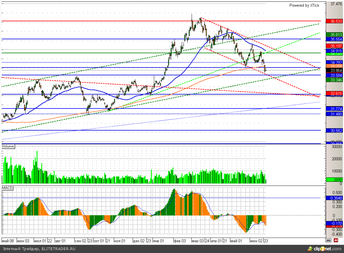 На этом фоне пара доллар/рубль благополучно отскочила от нижней границы нисходящего канала в районе отметки 33,7 и теперь вновь пытается закрепиться выше 34. Позитива доллару прибавляет хорошая макроэкономическая статистика США. В частности индекс потребительского доверия в июне вырос до 85,2 при средних ожиданиях на уровне 83,6, а продажи новых домов поднялись в мае до 504 тыс. с 425 тыс. месяцем ранее. При этом нефтяные котировки в ожидании снижения напряженности в Ираке сегодня корректируются, что лишь добавляет негатива российской валюте. Окончание налогового периода в стране также не позитивно для дальнейшего спроса на рубли. Единственное, что играет на стороне национальной валюты РФ – это прекращение покупок Банком России иностранной валюты для пополнения Резервного фонда. Последняя покупка была осуществлена 23 июня.