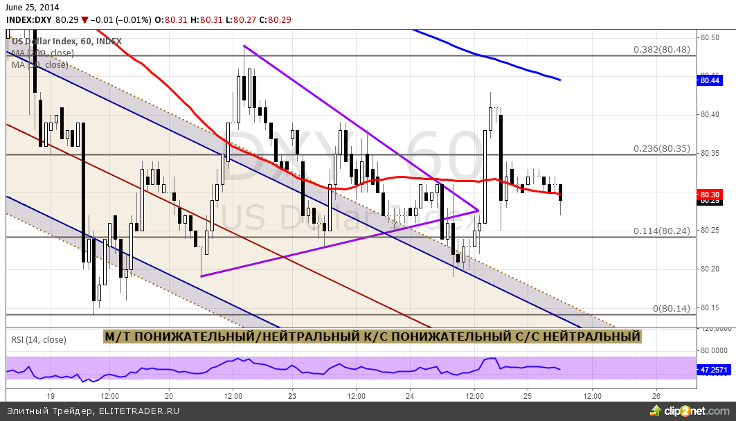 Индекс доллара США (DXY) после повышения волатильности на новостном фоне вернулся к линии 50 часовой скользящей средней 80.30. Ранее обозначенные уровни поддержек в виде уровня 80.24 и верхнего зубца нисходящих вил Эндрюса, а также сопротивления на линии 200 часовой MA (80.44) сохраняют свою актуальность.