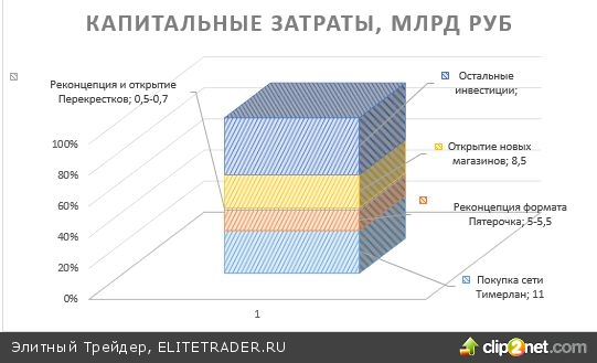 Ранее компания объявила о снижении темпов обновления магазинов формата «Пятерочка» и по итогам 2014 года планирует, что число обновленных точек составит 800. По моим подсчетам, это может стоить компании около 5-5,5 млрд руб. К тому же недавно стало известно, что X5 собирается купить торговую сеть Тамерлан и сумма этой сделки может составить порядка 11 млрд руб. В результате только на обновление Пятерочки и приобретение магазинов компания потратит 16-16,5 млрд руб.