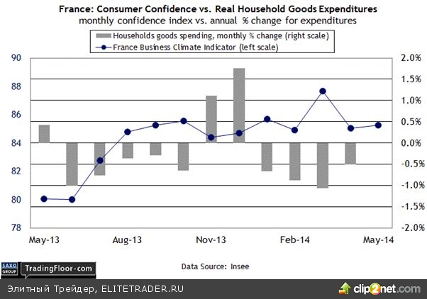 Франция: индекс потребительского доверия (06:45 GMT) Настроения в деловых кругах Франции немного ухудшились, о чем говорит вчерашний правительственный отчет по индикатору делового климата. Базовый индекс опустился к минимальному с сентября прошлого года значению, подтвердив, что и без того уже очевидно: перспективы второй по величине экономики Европы остаются неустойчивыми. Повод для осторожности дает также опережающий компонент вчерашнего отчета: индекс ожиданий производства резко упал, достигнув минимального за 11 месяцев значения.