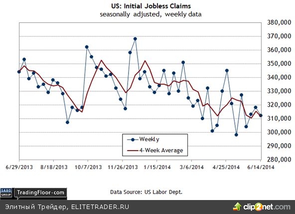 США: первичные обращения за пособием по безрабоице (12:30 GMT) Новые заявки на получения пособия по безработице продолжают сокращаться, что предполагает продолжение роста уровня занятости по платежным ведомостям в июне – отчет будет опубликован в следующем месяце. Как показал отчет на прошлой неделе, новые заявки на получения пособия по безработице сократились до 312,000, приблизившись к 7-летнему минимуму 298,000, достигнутому по итогу недели на 7 мая. Экономисты прогнозируют лишь незначительное снижение сегодняшнего показателя – на 2,000 до 310,000. В случае отсутствия неожиданного роста этого индикатора мы продолжим рассчитывать на ускорение темпов создания новых рабочих мест в обозримом будущем.