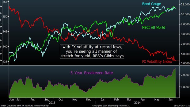 Позиция ФРС в отношении низких ставок в течение длительного периода вызвала рост акций и облигаций на фоне снижения волатильности. Подобная позиция также питаетинфляционные ожидания, что грозит снижением стоимости активов. График дня демонстрирует рост акций глобального индекса MSCI до беспрецедентных уровней; облигации в индексе Bank of America Merrill Lynch’s Global Broad Market также растут, индекс волатильности Deutsche Bank AG снижался, тогда как председатель ФРС Джанет Йеллен заявляет, что ставки, вероятно, останутся около нуля «в обозримом будущем».