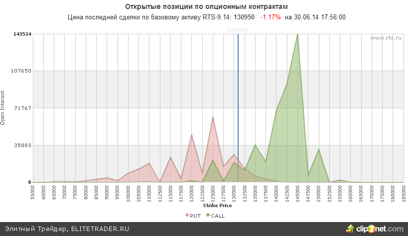 Между тем открытые опционные позиции по RIU4 со сроком исполнения 15.7.14 сейчас не дают однозначных сигналов. На отметке 140000 можно увидеть огромное количество опционов колл, которые выступают очень сильным сопротивлением. При этом максимальное количество опционов пут расположилось лишь вблизи уровня 125000.