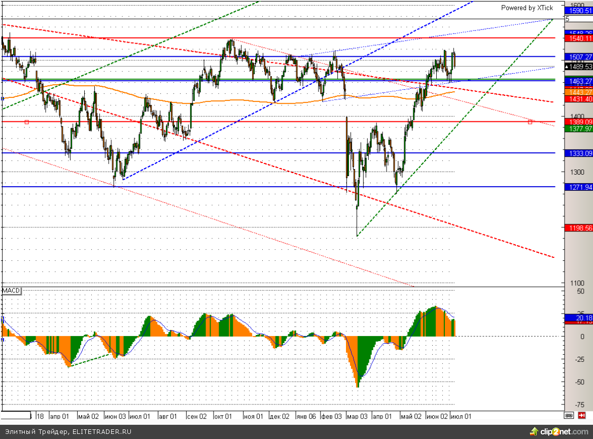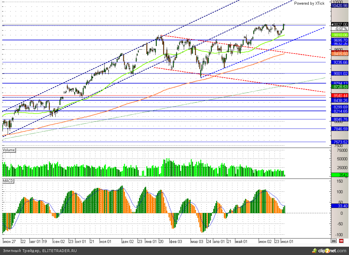 Индекс SnP500 практически добрался до серьезного сопротивления в районе 2000. Здесь сейчас проходит верхняя линия канала, пробить которую без дополнительных драйверов будет крайне не просто. Дополнительный сигнал на начало коррекции дает дивергенция между MACD гистограммой и ценой.