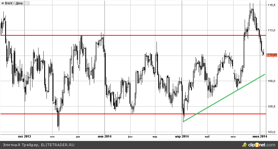 Между тем нефть сорта Brent в последние дни вернулась в диапазон 106 – 112 и сейчас подобралась к первой серьезной поддержке. Находится она на отметке 110. Поэтому в ближайшее время мы вполне можем увидеть небольшой отскок вверх от текущих уровней.