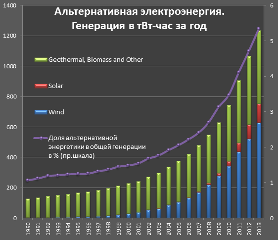 ТЭС компенсирует снижение доли атомной и гидроэнергетики. Рост доли альтернативной энергии никак существенно не сказывается на позиции традиционной энергии, т.е. старый добрый уголь и газ пока доминирует. Альтернативная энергия активно растет, но существенных смещений в мировом энергобалансе не оказывает. С другой стороны, какой мир будет через 20 лет? По всей видимости альтэнергия займет около 15% общей генерации.