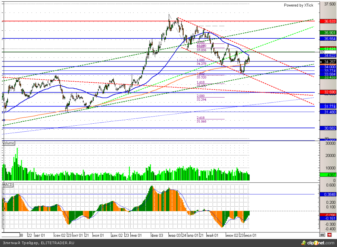 Еще накануне глава Минэкономразвития в своем докладе президенту дал предварительную оценку росту российской экономики во втором квартале, и надо сказать оценка эта была более чем положительной. ВВП за данный период вырос на 1,2%, а промышленное производство на 2,5%. При этом такой опережающий индикатор, как индекс деловой активности в развивающихся странах от банка HSBC показал в июне сильный рост и достиг отметки 52,3 после 50,6 месяцем ранее. Начали появляться позитивные сдвиги в российской экономике, что должным образом отразилось и на национальной валюте, которая вполне ожидаемо отскочила от отметки 34,65 и уже добралась до первой цели роста в районе 34,30. Дальнейшая динамика уже во многом будет зависеть от публикации протоколов ФРС, которая состоится завтра. Если здесь мы увидим определенные сигналы к более быстрому сворачиванию стимулирования, то укрепление доллара может быть существенным.