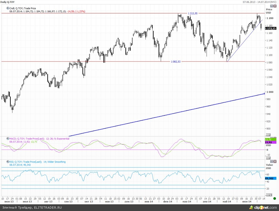 Говорить о высокой вероятности значительной коррекции можно будет лишь по факту спуска котировок ниже 1920. В этом случае падение от максимумов составит более 3%, а как мы уже отмечали на прошлой неделе, именно провал такого размера в текущей ситуации перегретости может стать губительным для up-тренда. Кроме того, спуск к 1920 будет означать третье касание нижней границы очередного локального восходящего канала. До сих пор в рамках всех каналов мы наблюдали лишь две обозначенные точки опоры, после чего угол наклона бычьей тенденции увеличивался, и приходилось обрисовывать новый коридор. Другими словами, при спуске к 1920, высока вероятность, что граница не выдержит и индекс пойдет ниже.