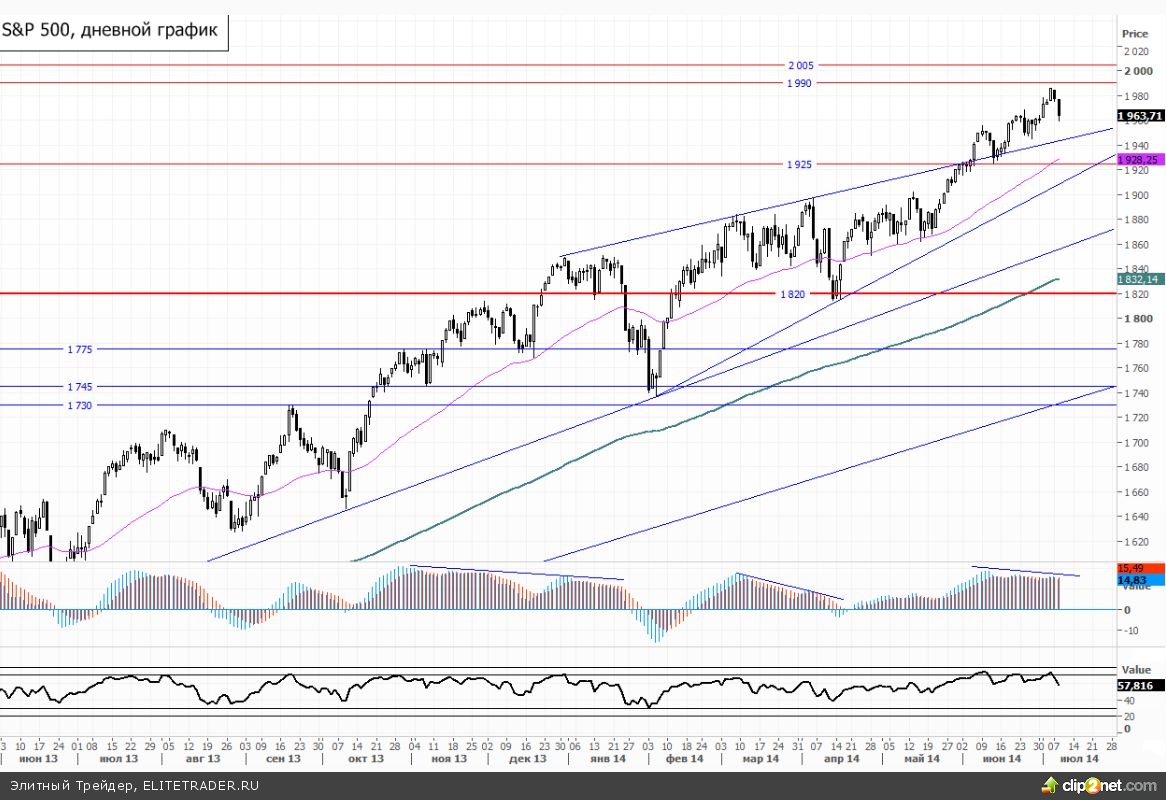 В данный момент сентябрьский фьючерсный контракт на SnP 500 торгуется повышением на 0,03%, около отметки 1961.