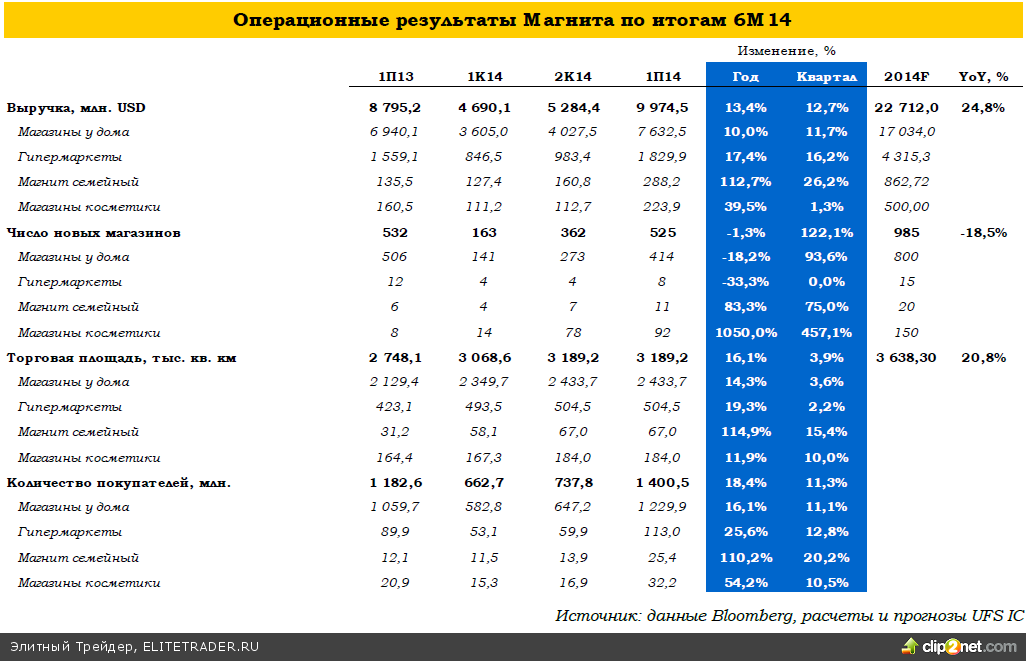 «Магнит» продемонстрировал уверенное увеличение выручки в 2К14 как в годовом, так и в квартальном сопоставлении. В 1К14 результаты были достаточно слабыми из-за ослабления рубля и падения покупательской активности в связи с ростом опасений относительно ухудшения ситуации в экономике. Тем не менее, после того, как ситуация на валютном рынке стабилизировалась, улучшилась и обстановка в ритейле. Темпы роста стали восстанавливаться, вернувшись на прошлогодние уровни и даже превысив их. По итогам июня рублевая выручка «Магнита» выросла на 32,75%, что является рекордным показателем по итогам текущего года, и выше среднего темпа роста выручки в прошлом году.