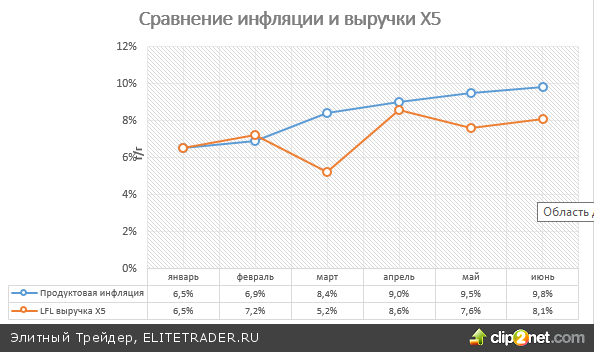 Если скорректировать показатель роста выручки на инфляцию, становится очевидно, что тенденция на самом деле не столь позитивна и фактически у компании наблюдается снижение сопоставимой выручки. Это означает, что, несмотря на все усилия менеджмента Х5 по увеличению привлекательности магазинов сети, покупатели отдают предпочтения другим ритейлерам.
