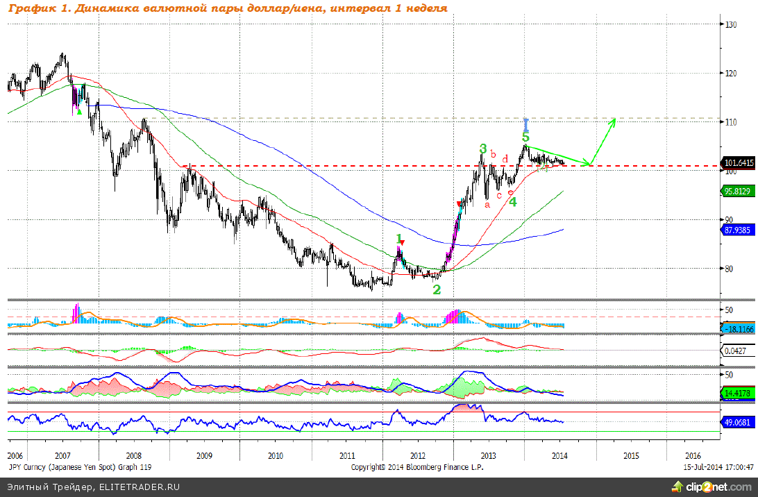 Иена к доллару завершила формировать импульс ослабления, который развивался в 2012-2013 годах, и консолидируется. На наш взгляд, замедление активности в валютной паре продлится до конца текущего года, после чего соотношение американского доллара и японской иены поднимется к отметке 111 иен за доллар. Текущие уровни довольно плотно проторгованы и достаточно точно позволяют предположить уровни для следующего шага. Предположительная динамика валютной пары доллар/иена отображена на графике 1. Индикаторы: MACD на недельном графике продолжает отрабатывать сигнал вниз. Индикатор повышения DMI+ и индикатор понижения DMI- сошлись; индикатор силы тренда ADX расположен в нижней части шкалы и направлен вниз, что указывает на прекращение восходящего тренда, вызванное консолидацией котировок. Индикатор, основанный на динамике ADX, в настоящее время выглядит нейтрально. Осциллятор RSI находится в средней части шкалы, сигналов нет. Рекомендуем: покупку долларов за иены по цене 100,50 иен за доллар с целью продать на уровне 111,00 иен за доллар (+10,45%), стоп-приказ на отметке 100,00 иен за доллар (-0,50%), временная перспектива — 10 месяцев. Поддержка: 100,50; 100,00; 98,00; 96,00. Сопротивление: 102,20; 104,00; 105,20; 111,00.