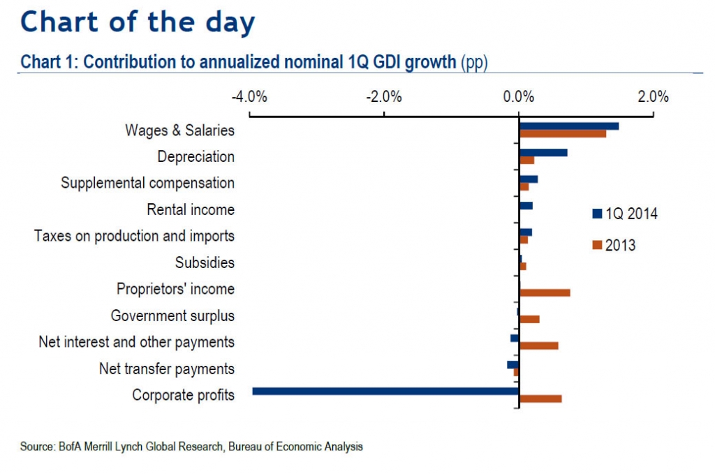 На графике видно, что корпоративные прибыли в первом квартале сократились примерно на 4%, тогда как наибольший вклад в национальный доход привнес рост заработной платы.