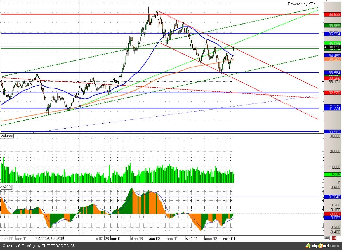 Влияние введенных санкций, вряд ли, будет скоротечным и в ближайшее время негативно скажется на состоянии экономики страны и соответственно национальной валюте. Сейчас пара доллар/рубль приблизилась к верхней линии нисходящего канала, пробой которой даст сигнал к новой волне роста. Впрочем, некоторую остановку в районе 35 мы вполне можем увидеть, но воспринимать ее как хорошую возможность для продаж, пожалуй, не стоит.