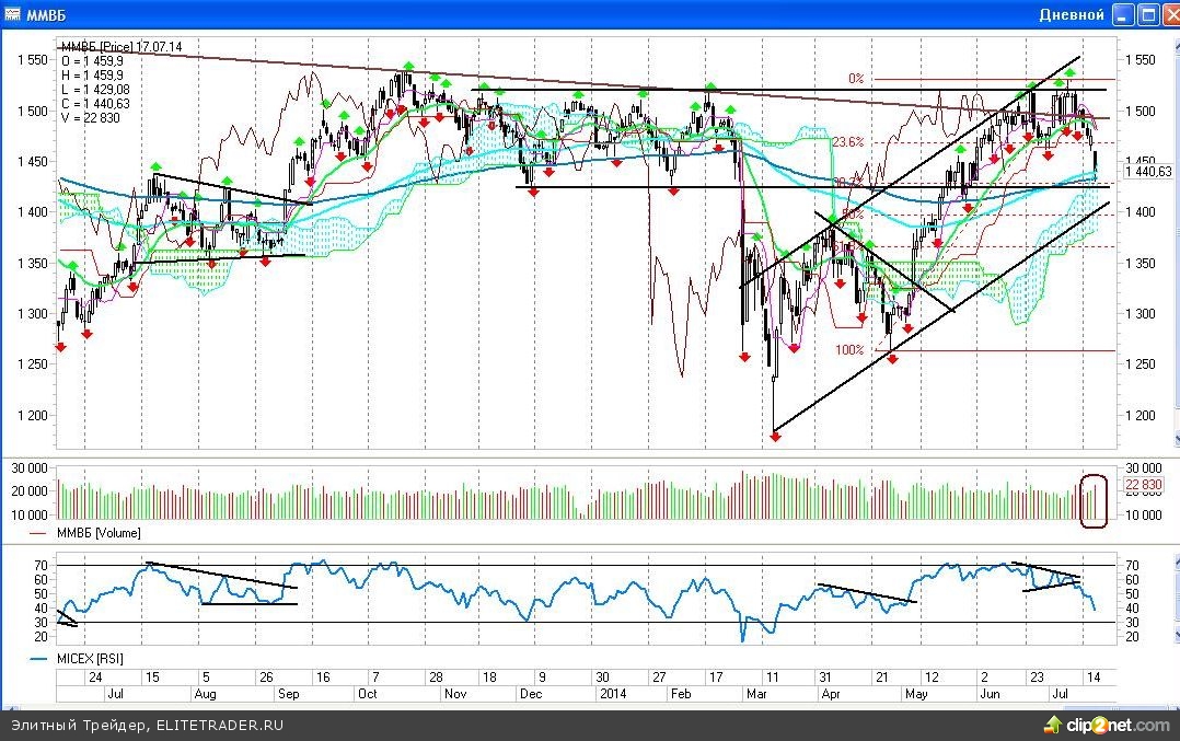 В ходе вчерашних торгов индекс ММВБ опускался на уровень 1429,08 пунктов, что соответствует, как и зоне скопления дневных скользящих средних ЕМА100 и ЕМА200, так и «старому» горизонтальному рубежу, актуальному в период декабря 2013-февраля 2013 гг. А еще на отметку 1428,25 пунктов попадает 38,2% уровень Фибоначчи от роста 1260,43-1531,99 пунктов.