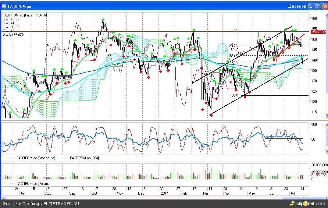 В минимуме дня котировки опускались до отметки 138,23 рублей и локально даже выходили за пределы линии поддержки среднесрочного восходящего тренда. А это значит, что нам стоит задуматься над тем, не готовы ли акции перейти в новый торговый диапазон, который находится под линией поддержки текущего тренда?