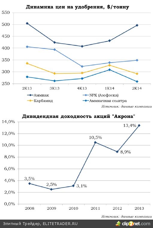 Отдельно отметим рост производственных показателей в сегментах КАС (+24,8% г/г) за счет расширения мощностей, а также увеличение выпуска апатитового концентрата на ГОК «Олений ручей» (+58% г/г). Общий выпуск удобрений Группой «Акрон» увеличился в первом полугодии на 3,7% до 2,753 млн тонн. Отгрузка товарной продукции внешним покупателям возросла на 6,2% до 3,282 млн тонн. Для сравнения, выпуск хлоркалия «Уралкалием» в первом полугодии вырос на 33,3% с 4,5 до 6,0 млн тонн. В динамике цен на удобрения по- прежнему отдаются отголоски прошлогоднего развала калийного картеля, повлекшего за собой ослабление на всех рынках удобрений, не только калийных. Отметим, что в квартальном сопоставлении наблюдался рост цен на аммиак и на удобрение КАС. На отдельные рынки, например, на рынок карбамида, давление оказывает рост экспорта со стороны Китая, что привело к снижению цен на карбамид. В итоге, во втором квартале мы ожидаем выручку производителя на уровне $548 млн (19,17 млрд руб.), что на 10,5% выше уровня первого квартала. Полугодовая выручка может составить 36,521 млрд руб. (+6,6% г/г), или $1,044 млрд (-5,4% г/г). В целом, результаты вышли без неожиданностей, и мы оцениваем их нейтрально: производственные мощности растут, выпуск умеренными темпами увеличивается, цены стабилизируются. Руководство сохраняет оптимистичный взгляд на рынки нитратных удобрений (аммиачная селитра, КАС), основные для азотного бизнеса Группы. Высокий спрос будет сохраняться со стороны Латинской Америки и Индии. Обновленное Правительство в Индии приняло решение о сохранении субсидий фермерам на 2014-2015 финансовый год, однако признало, что в последнее время индийскими фермерами было внесено слишком много азотных удобрений (карбамида) в ущерб калийным и фосфорным. Это может ограничить рост спроса на азотные удобрения в будущем.