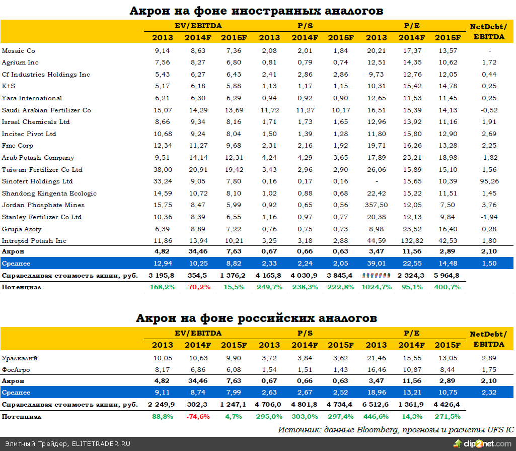 Добавим, что по итогам 2013 года дивидендные выплаты «Акрона» составили 152 руб. на акцию, всего 6,16 млрд руб., или 47% от годовой чистой прибыли по МСФО. Дивидендная доходность превысила 12%, став самым высоким показателем в отрасли («Уралкалий» – 1,08%, «ФосАгро» – 1,57%, НКНХ – 4,4% по обыкновенным акциям и 6,2% по привилегированным). После того, как Совет директоров рекомендовал дивиденды в апреле 2014 года, бумаги «Акрона» подорожали почти на 20%, однако сразу после закрытия реестра потеряли около 12%. Сейчас динамика акций «Акрона» в большей степени зависит от динамики рынка. Среди драйверов к росту стоимости компании отметим следующие. Во-первых, относительно иностранных аналогов по рыночным мультипликаторам (EV/EBITDA, P/S, P/E) «Акрон» по-прежнему торгуется с существенным дисконтом. Во-вторых, на балансе Группы находится пакет акций «Уралкалия» (1,77% капитала), рыночная доля пакета составляет 7,589 млрд руб. (около $217 млн). «Акрон» уже сообщал о намерении монетизировать это вложение, и в случае реализации пакета, вырученные средства могут быть направлены на собственную инвестпрограмму производителя. Мы подтверждаем оценку справедливой стоимости обыкновенных акций «Акрона» на уровне 1603 рубля за бумагу ($4,86 за GDR). Рекомендация ПОКУПАТЬ.