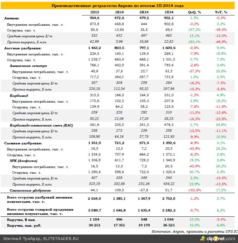 Группа «Акрон» опубликовала производственные результаты первого полугодия. В основных для компании сегментах – азотных удобрений и NPK – наблюдался рост производства. Выпуск азотных удобрений увеличился в первом полугодии на 9,4% относительно аналогичного периода 2013 года, выпуск сложных удобрений – на 3,1%, в том числе производство удобрений NPK выросло на 2,6%. В квартальном сопоставлении по большинству наименований зафиксировано снижение объемов выпуска, однако, это традиционное ослабление спроса в связи с окончанием посевного сезона в Европе и еще не начавшимся сезоном в странах Латинской Америки. В третьем квартале 2014 года рост спроса на удобрения со стороны латиноамериканских и индийских потребителей поддержит результаты «Акрона».