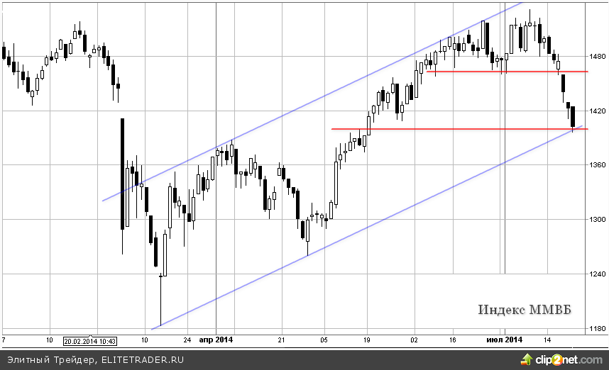 К сожалению, за выходные негативный внешний фон, связанный с новыми санкциями и крушением авиалайнера на Украине, так и не успокоился, российские индексы открывают новую пятидневку уверенным снижением индексов: индекс ММВБ теряет 1.4%, индекс РТС в минусе на 1.3%; на максимуме падение составляло более 1.7% соответственно.