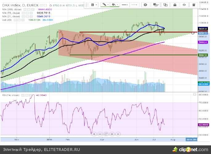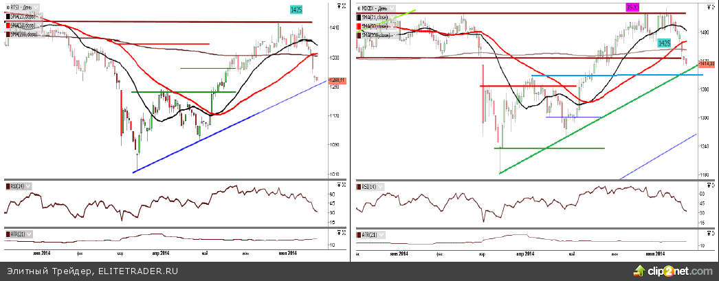 Как и предполагалось в прошлых обзорах, коррекция была предпочтительней и, безусловно, геополитические новости подтолкнули рынок в «нужном « направлении. Таким образом, пробой основных скользящих средних трансформировал структуру в негативную. Многое, конечно, будет зависеть от новостного потока. С технической точки зрения, рынок стал очень быстро перепроданным. Поддержка РТС расположена на уровне 1236, хотя и 1200 круглый уровень может стать привлекательным для долгосрочных инвесторов. По ММВБ 1390-1400 является поддержкой, хотя 50% фибо находится на уровне 1350. Модельное значение ММВБ- 1325. Рынок перепродан, поэтому часто встречается негативное открытие и разворот в плюс, формирующий отскок. Выступление Путина на Собез 22 июля может преподнести положительный сюрприз.