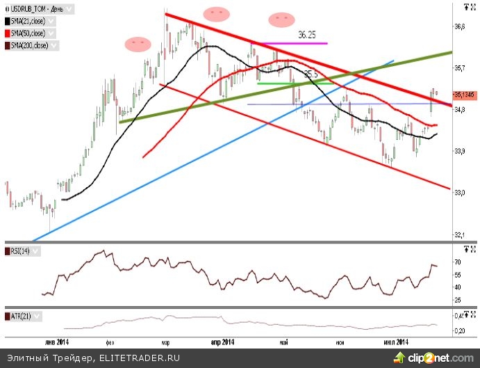 С технической точки зрения проба нисходящего канала (красный цвет) является негативной для рубля с неприятной технической целью 36,50 руб. за долл, но думаю, что динамика будет не сильной и пока 35,50 руб. будет сильным сопротивлением, если новости не будут форс-мажорными. Думается, что все же рубль, наиболее вероятно, будет находиться не выше 36,25 руб. за долл.