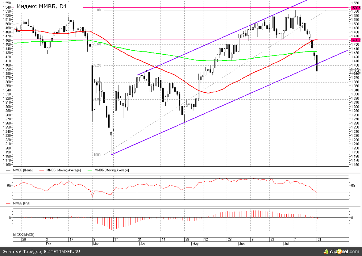 С начала июля индекс ММВБ потерял уже более 6% (от максимумов более 9%), а РТС более 9%. Этот технический момент в краткосрочной перспективе должен играть на руку быкам, в плане развития краткосрочного отскока. Но, если взглянуть на динамику индекса ММВБ на недельном таймфрейме здесь видим развитие трехлетнего боковика и сейчас мы уверенно отступаем из его верхней зоны в направлении противоположной границы.