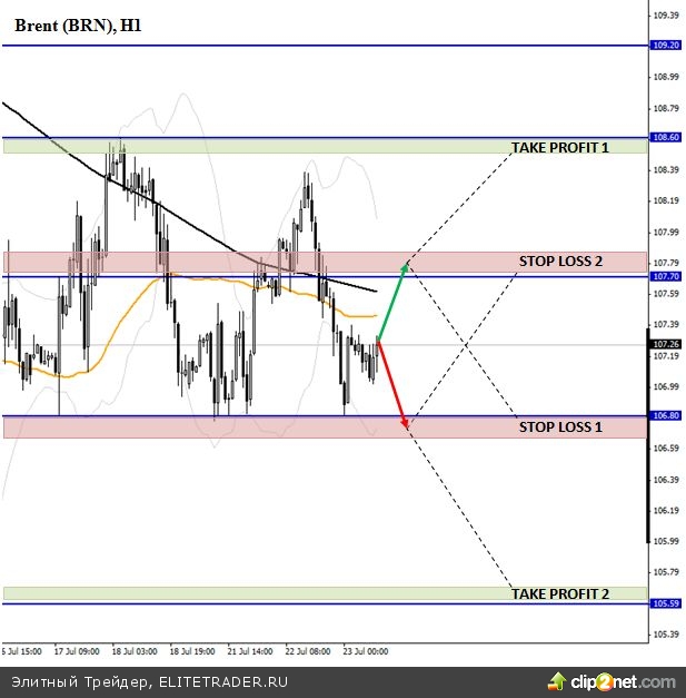Стратегия 1. Покупаем Brent, если котировки закроются выше уровня сопротивления 107,70. Цель 108,60. Stop-Loss = 106,70