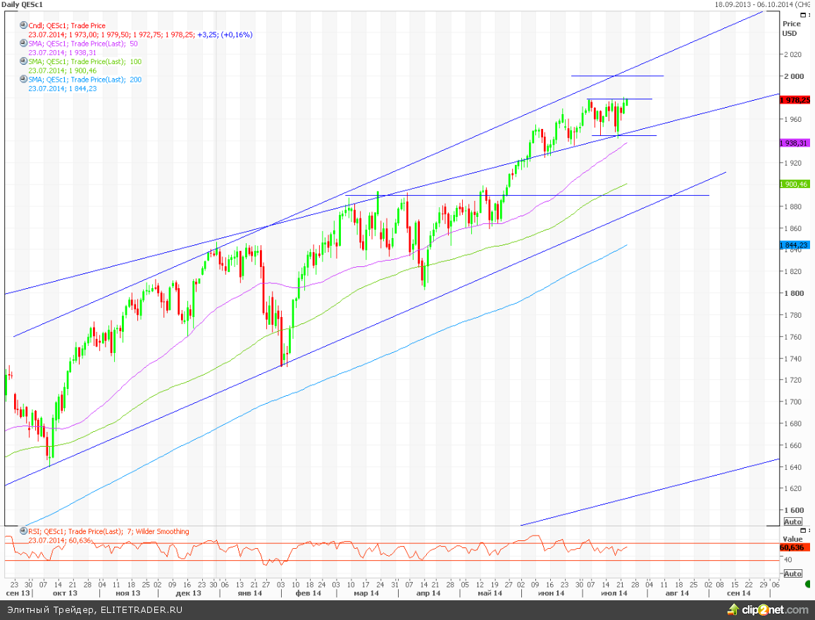 Техническая картина: наступление сезона корпоративных отчетов ознаменовалось уходом SnP 500 в боковик. Сейчас фьючерс на SnP 500 торгуется в районе его верхней границы, пробитие которой может привести к росту в район психологической отметки в 2000 пунктов. В принципе, ничего не мешает продолжению движения фьючерса в рамках торгового диапазона еще какое-то время. Нижняя граница боковика – 1945 пунктов. Лишь при пробитии данного уровня можно будет сделать предположение о начале более или менее ощутимой коррекции.