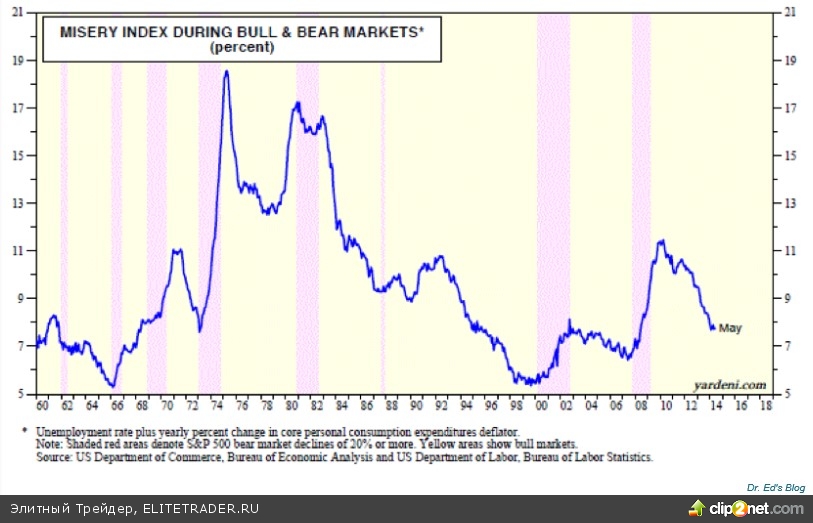 Мнения: Так называемый «Индекс нищеты» указывает на продолжение бычьего рынка, сообщает нам Business Insider. Этот индекс формируется из показателей безработицы и потребительской инфляции и начинает резко расти в преддверии слома долгосрочного ростового тренда. Сейчас такого нет. Несмотря на структурные проблемы, экономика США относительно устойчива. Данный тезис не исключает возможности начала среднесрочной коррекции на американских торговых площадках, но в целом предполагает довольно оптимистичный подход к торговле.