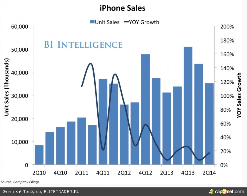 При этом ключевым источником доходов компании остаются смартфоны iPhone, продажи которых выросли на 13% до 35,2 млн единиц – на уровне прогнозов рынка. Интересно, что в условиях острой конкуренции темпы роста продаж девайсов за последний год заметно снизились.