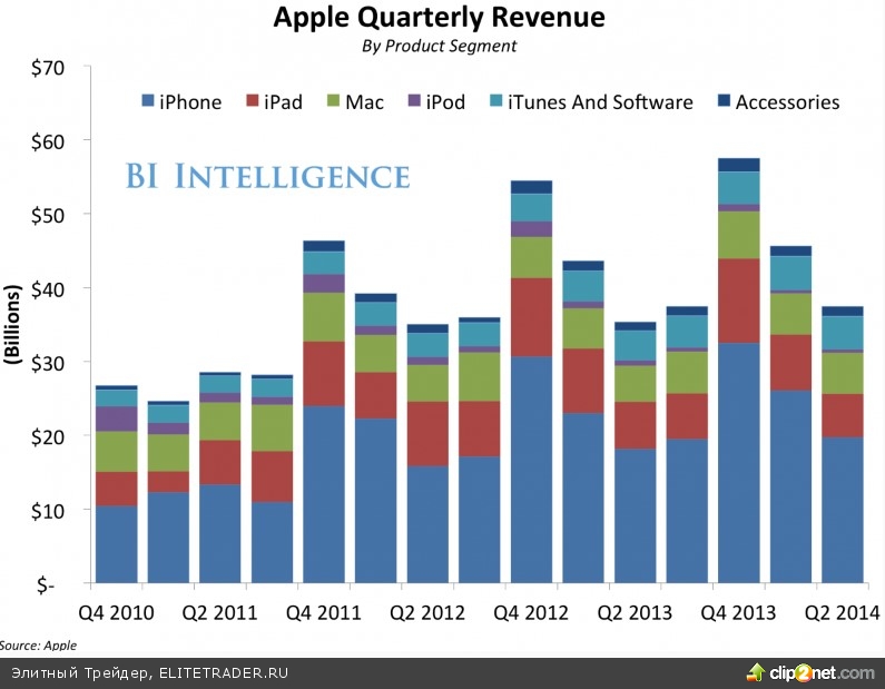 Также компания дала весьма консервативный прогноз. Выручка за текущий квартал может составить $37-40 млрд (аналитики ожидали $40,4 млрд). Надо сказать, что данная практика достаточно типична для компании, и если релиз долгожданного iPhone6 с широким дисплеем пройдет успешно, то Apple легко сможет побить заниженные ожидания.