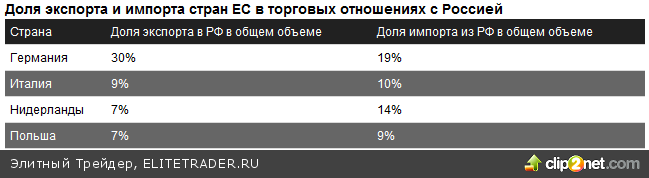 Даже не принимая во внимание газовые поставки из России в Европу, нельзя не учитывать влияние даже небольшого нарушения товарных потоков. В этом случае Европа потеряет часть ключевого рынка сбыта и столкнется с нехваткой сырья. Взамен этого европейские компании получат мертвый украинский рынок, который не сможет обеспечить необходимые поставки, а экспорт на Украину также будет бесполезен ввиду отсутствия спроса. Обмен получается совсем неравноценный.