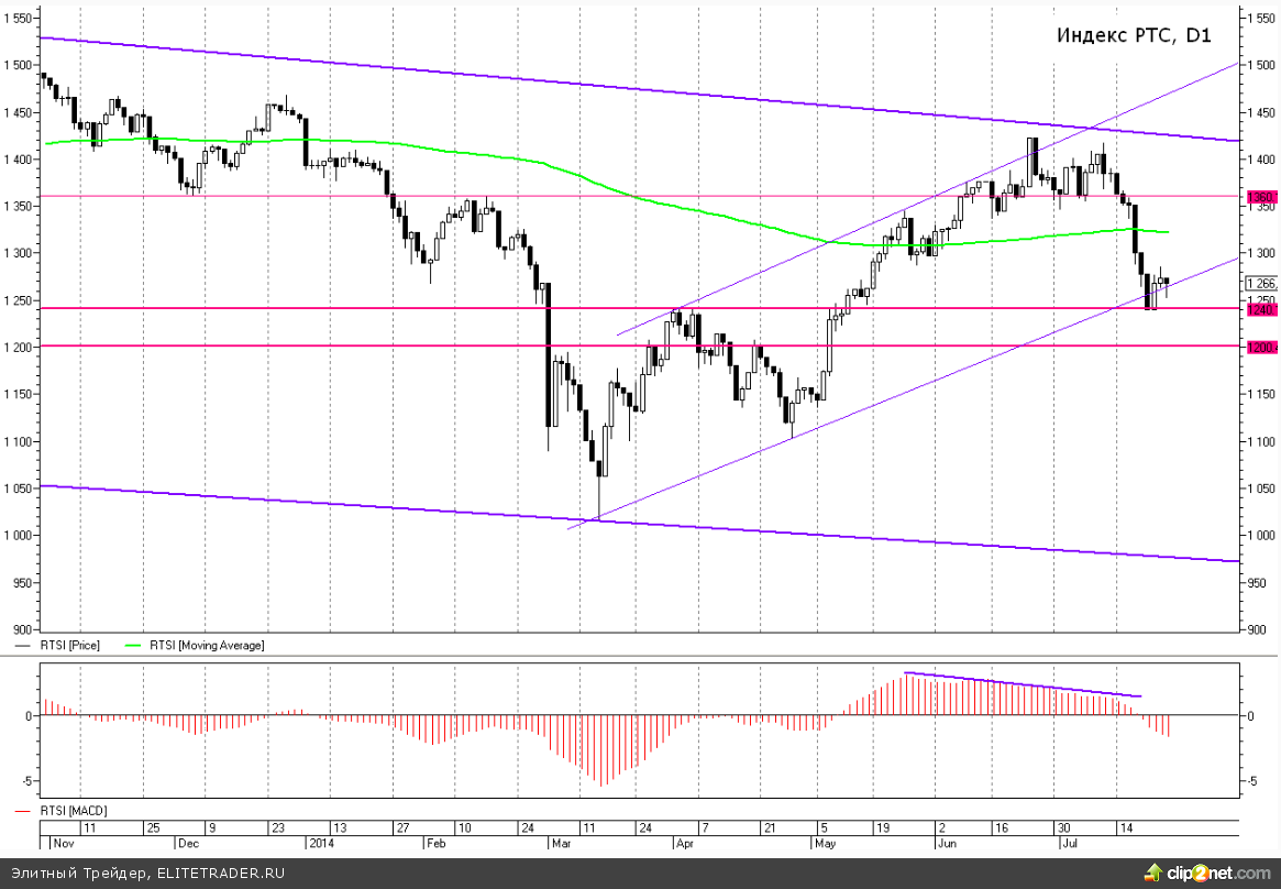 Тем не менее, глядя на дневной график индекса РТС можно сказать, что на минимумах месяца индекс оттолкнулся из хорошо знакомой и довольно широкой зоны долгосрочных поддержек 1200-1240 пунктов, а вчера была выкуплена значительная часть внутридневного снижения, которое даже не дотянуло до данной зоны поддержек. Если развитию новой волны роста быть, то текущие уровни это вполне подходящий плацдарм для этого, с учетом вышеназванной поддержки.