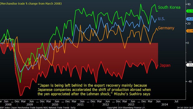 Японский экспорт продолжал снижаться, тогда как поставки из Германии, Южной Кореи и США превысили уровни до кредитного кризиса 2008 года, демонстрируя, что дешевая иена не остановила производителей страны от переезда за границу.