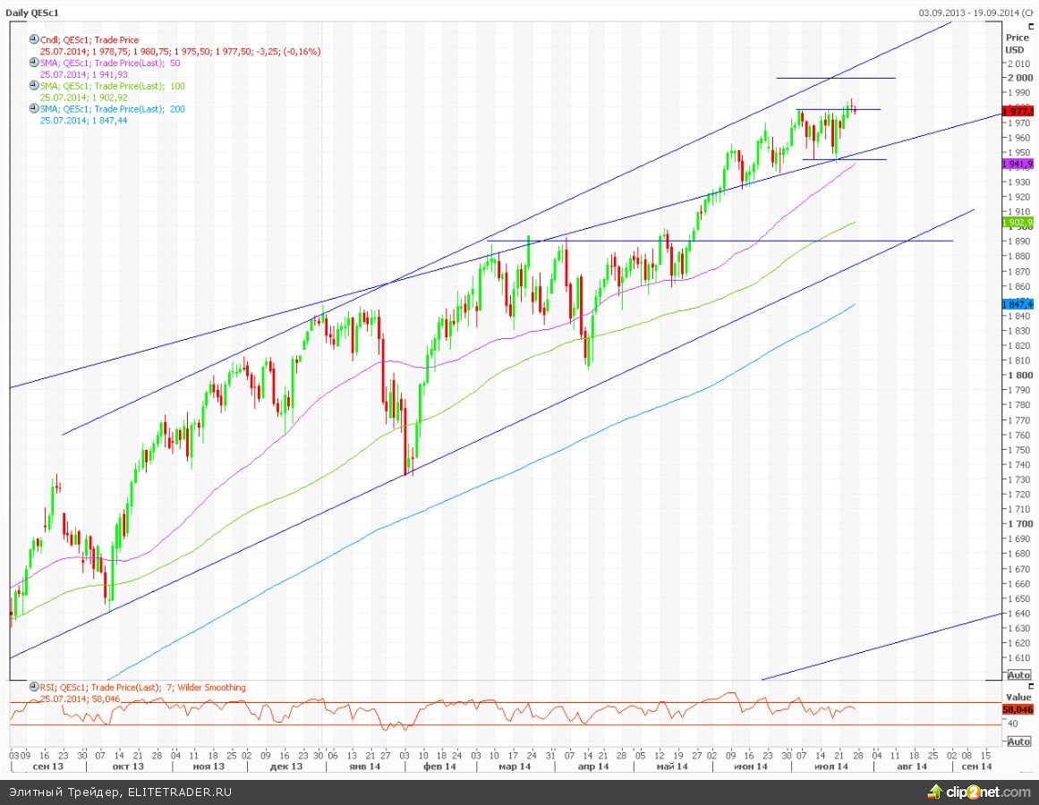 Техническая картина: вчера SnP 500 обновил исторический максимум, за этим последовал откат. На данный момент фьючерс завис в районе верхней границы старого боковика, пытаясь вернуться в диапазон. Если это произойдет, то мы можем увидеть снижение на нижнюю границу фигуры – 1945 пунктов. Лишь при прохождении данного уровня можно будет прогнозировать начало более масштабного падения. В случае если движения вниз от текущих уровней не произойдет, и котировки удержаться, то вероятно в ближайшее время мы увидим красивую цифру в 2000 пунктов по SnP 500.