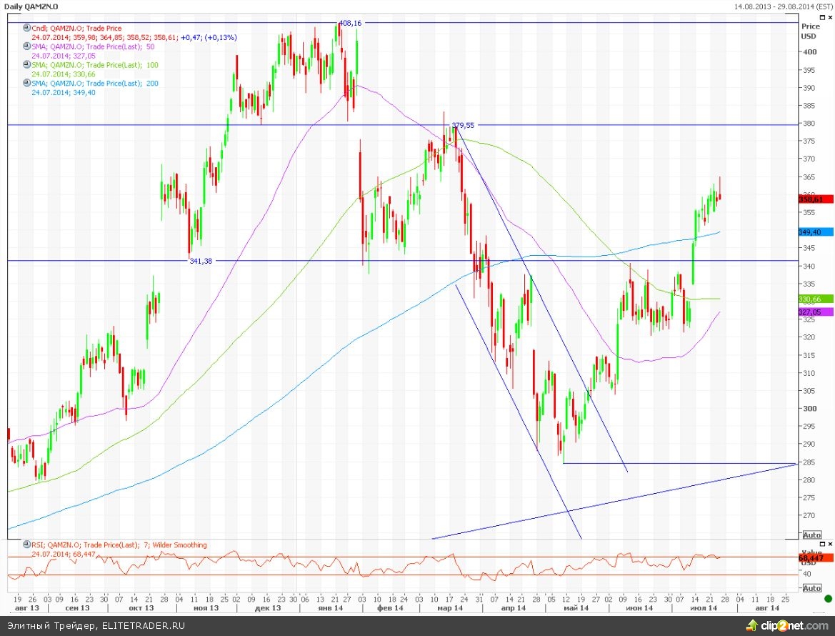 Техническая картина: в конце весны бумаги сломали нисходящий тренд и начали поступательный рост. Однако похоже, что вчерашний отчет слом позитивную тенденцию. Если брать за основу котировку на постмаркете, очевидно, что бумаги ушли ниже статической поддержки ($341,4). В обозримой перспективе вероятно продолжение падения – возможно до весенних минимумов и линии долгосрочного восходящего тренда (примерно $285). Бывало, что акции Amazon после негативных отчетов начинали расти. Об изменении технической картины и возможном возобновлении роста можно будет говорить при возвращении бумаг выше $341,4.