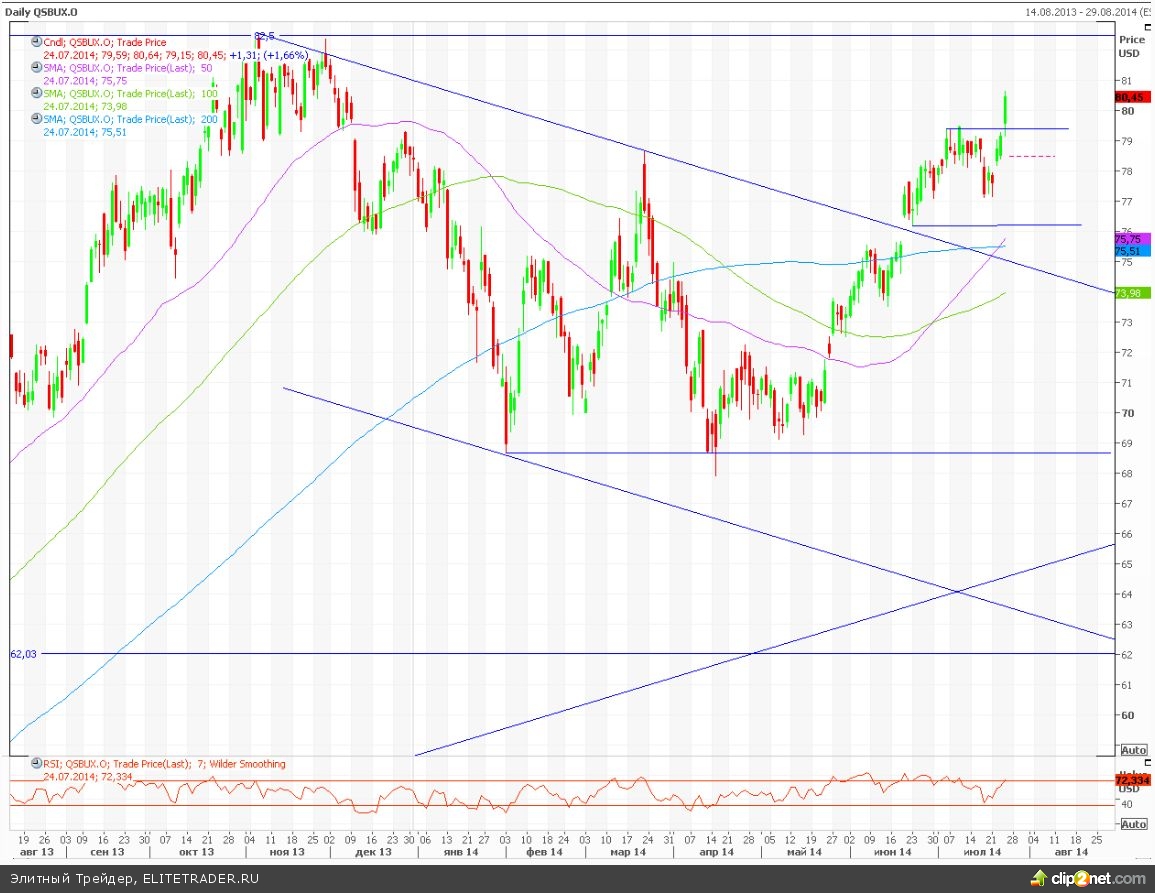 Техническая картина: вчера во время торговой сессии акции пробили июльское статическое сопротивление - $79,3. Однако рост был недолгим, на постмаркете бумаги вернулись под обозначенную линию. Теперь им открыта дорога на горизонтальную поддержку $76. При этом о серьезном изменении технической картины и начале серьезного падения можно будет говорить при уходе бумаг ниже старой линии нисходящего тренда - $74,5. В принципе, нельзя исключать продолжения роста и от текущих уровней с сегодняшним выкупом просадки. В этом случае акции могут устремиться к абсолютному максимуму ($82,5), однако перспектива подобного развития событий менее очевидна.