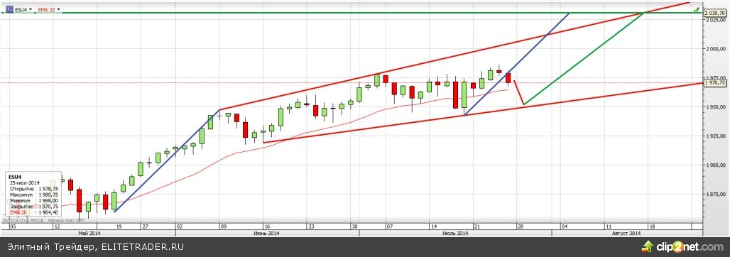 4. Дневной график текущего фьючерса ESU4 идет в форме расширяющегося клина. Мы рассматривали его уже в предыдущих блогах, но предлагаю к нему вернуться еще раз и набросать возможные варианты развития событий