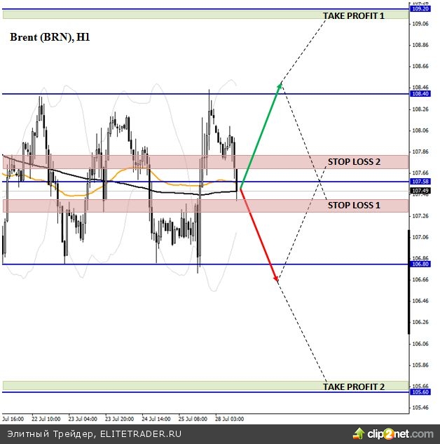 Стратегия 1. Покупаем Brent, в случае если цены закроются выше уровня сопротивления 108,40. Цель 109,20. Stop-Loss = 107,35